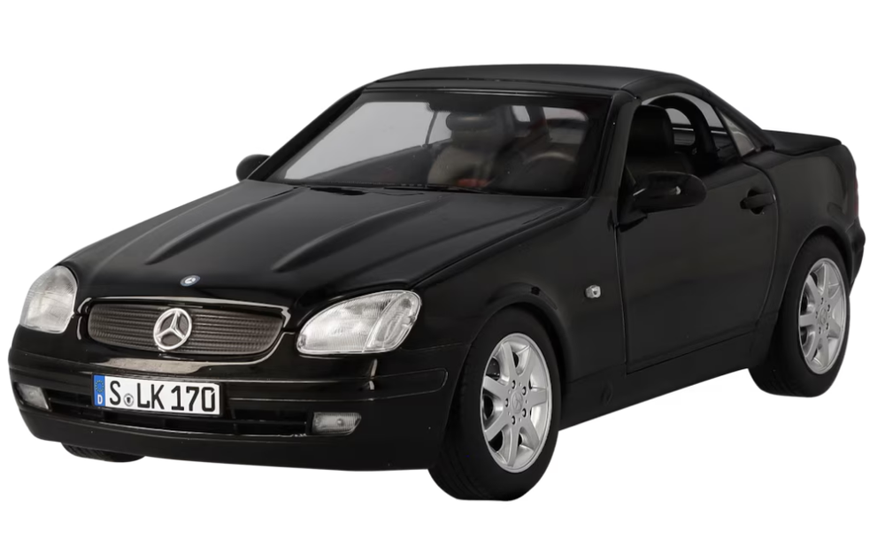 Sportowy, lekki, krótki (SLK) – po raz pierwszy zaprezentowany na targach motoryzacyjnych w Turynie w 1996 roku SLK 200 Roadster R170 opisuje prawdziwą historię sukcesu, która trwała do roku 2004 wraz z pojawieniem się liftingu i została zastąpiona przez SLK serii R171. Tym modelem inżynierowie oddali w ręce użytkowników samochód, który pod wieloma względami różnił się od innych roadsterów w tej klasie i imponował pod względem bezpieczeństwa, komfortu, ekologiczności i przydatności w codziennym użytkowaniu. Najbardziej charakterystyczną cechą tego roadstera był niewątpliwie dach Vario, stalowy dach, który można było całkowicie opuścić do bagażnika – w zaledwie 25 sekund – bez utraty sztywności ani wytrzymałości samochodu. Pod względem wyposażenia SLK Roadster nic nie pozostawiono przypadkowi: od wspomagania kierownicy i obręczy ze stopu metali lekkich po sportowe fotele i nostalgiczne okrągłe instrumenty w kokpicie, które przypominały wyposażenie starych samochodów wyścigowych. Kolejna cecha szczególna: wnętrze SLK Roadster zostało po raz pierwszy zaprojektowane w dwóch kolorach. Takiej samej dbałości o szczegóły można również oczekiwać od miniaturowego modelu Roadstera, który jest ręcznie składany z ponad 109 pojedynczych części i pomalowany na oryginalny kolor. Precyzyjny model zachwyca również wiernym odwzorowaniem wszystkich detali wnętrza w wysokiej jakości wykończeniu. Drzwi, maskę i tylną klapę można otwierać. Aby umożliwić wyjęcie roadstera z opakowania Mercedes-Benz Classic, zakres dostawy obejmuje również śrubokręt i rękawicę do odkręcania śrub styropianowego opakowania i chwytania modelu, chroniąc go przed odciskami palców.